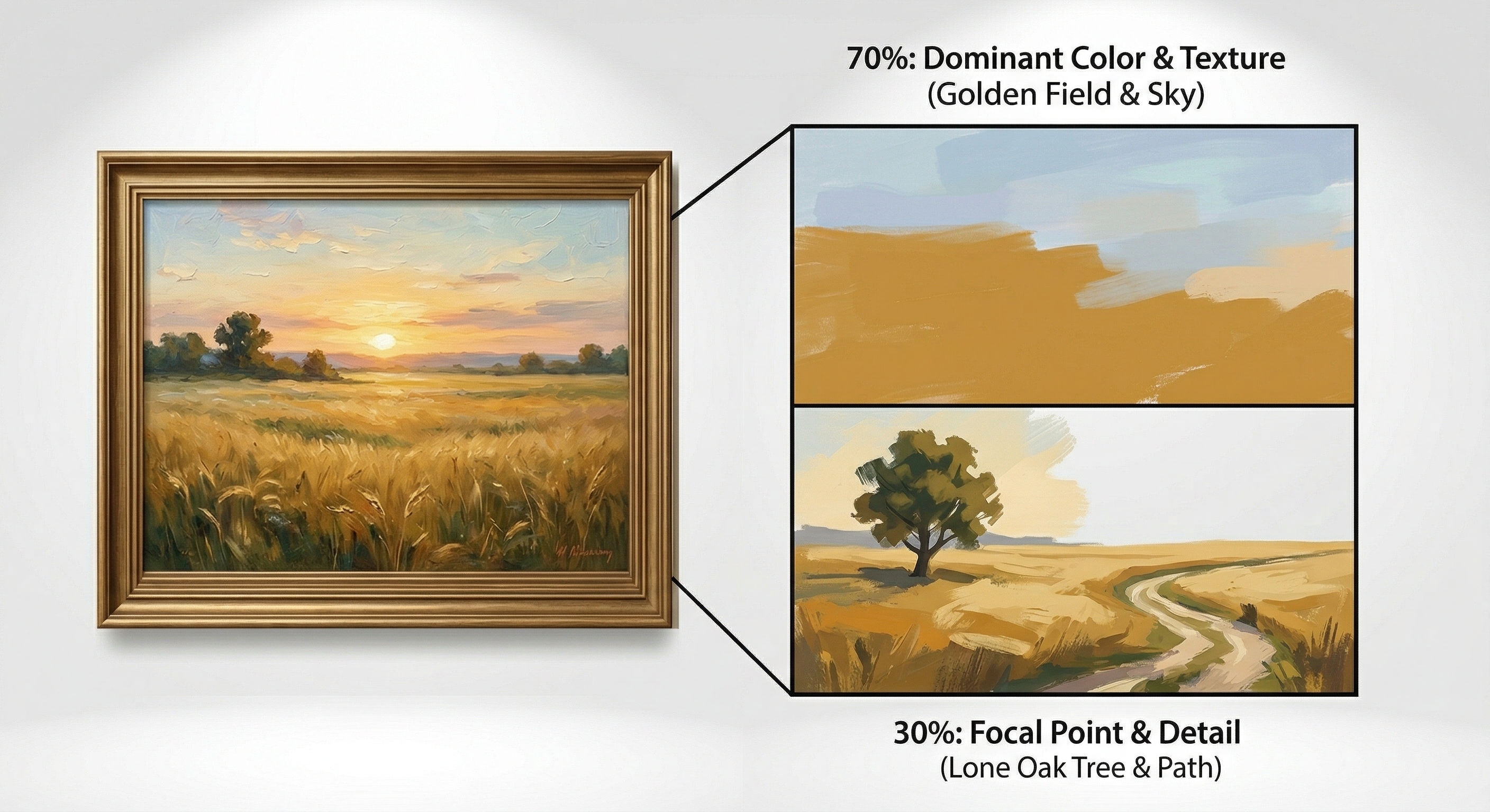 Image 2: A diagrammatic image that clearly demonstrates the concept of the "70-30 Rule in Art," decomposing a Casso vintage-style oil painting into 70% dominant element and 30% focal accent.